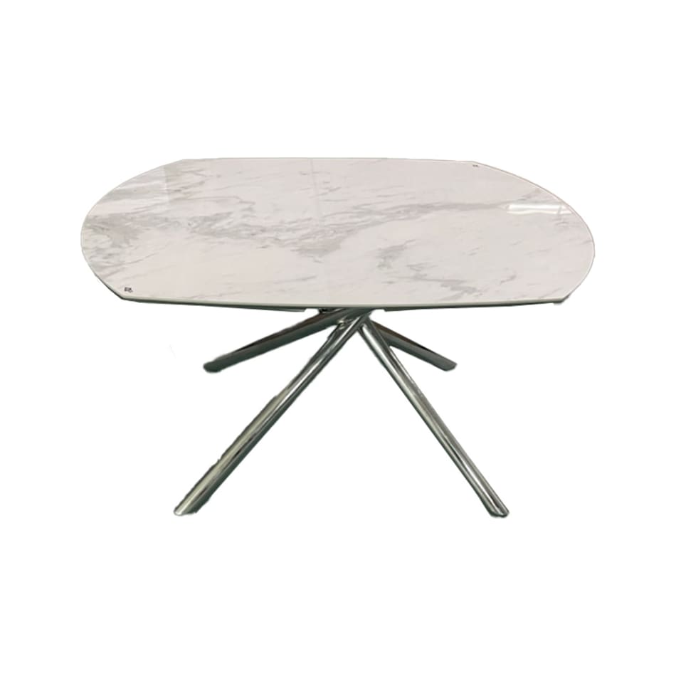 The Jackie Extendable Dining Table elevates any space with the simplicity of its ceramic on white glass top and elegant crisscross polished stainless steel legs. This table features an extendable top to expand or contract to fit to the desired size. Changing up the size and look of your dining area is easy with this dynamic design. Seats up to 6 people.